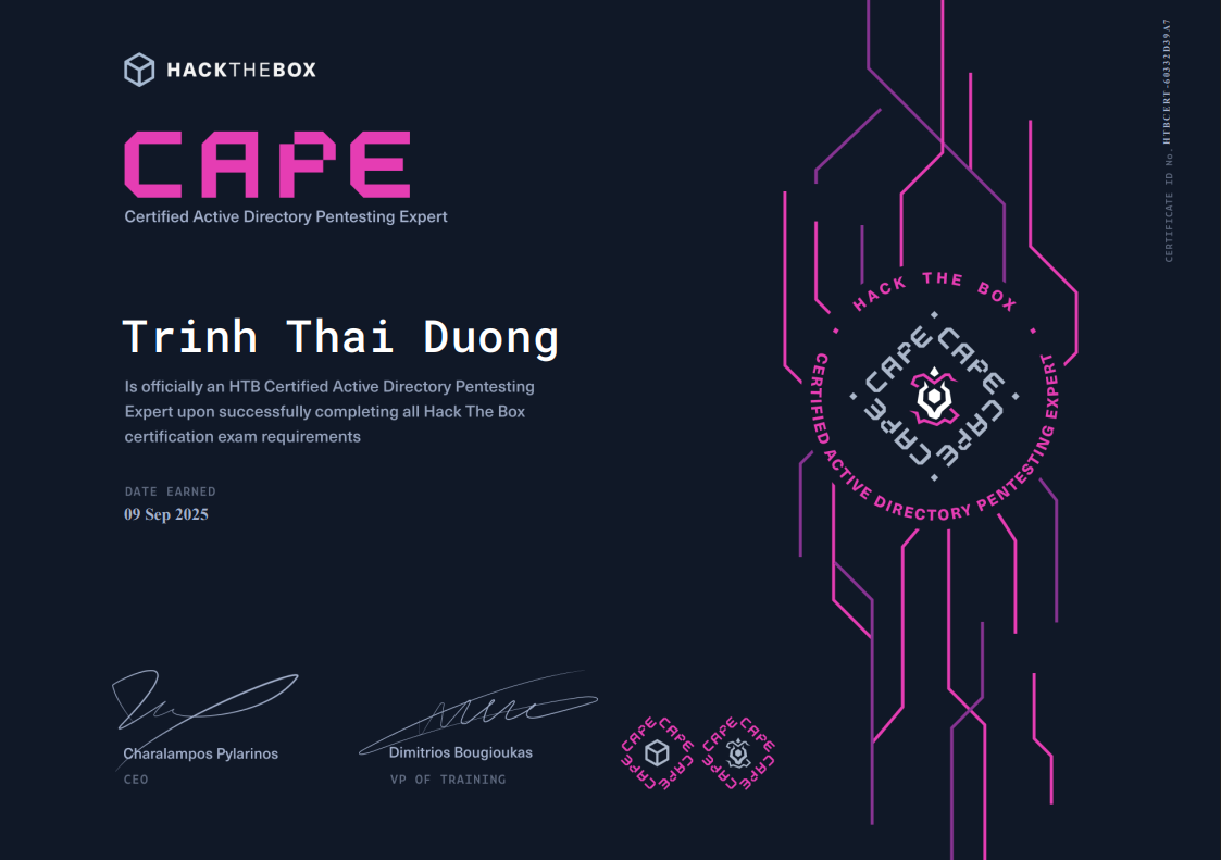 Mọi thắc mắc anh em có thể được giải đáp qua discord dwgth4i, stay strong và hãy luôn coi bài thi như là 20 ngày cộng thêm một lượt nghỉ giữa hiệp mỗi 10 ngày :D mình không farm chứng chỉ và cũng khuyên anh em không nên vậy, mà hãy chỉ coi nó như một minh chứng rằng mình thật sự đủ kĩ năng cho một việc gì đó thôi, mục tiêu sắp tới của mình khả năng sẽ là một cert gì đấy nặng hơn về evasion do đề thi CAPE cũng khá chill trong khâu evasion, và khả năng cao sẽ là CRTL (bản mới đang được Rastamouse làm lại) hoặc CRTM nếu như trong thời gian tiết kiệm tiền thấy không thích evasion nữa :v.