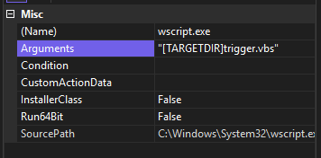 The Run method arguments are “The executable file path” “Windows style” “WaitOnReturn”, to make the msi run this smoothly, we need to add a reference to wscript.exe since the handler for vbs file default will be cmd.exe, which will make our script can not be successfully run, I will make a quick test right here.
