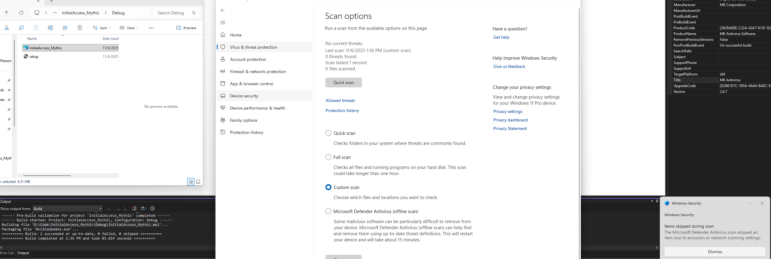 It should be cool now, lets compile it with Build -> Build Solution, we then have a malicious msi of our with no detection from the Defender