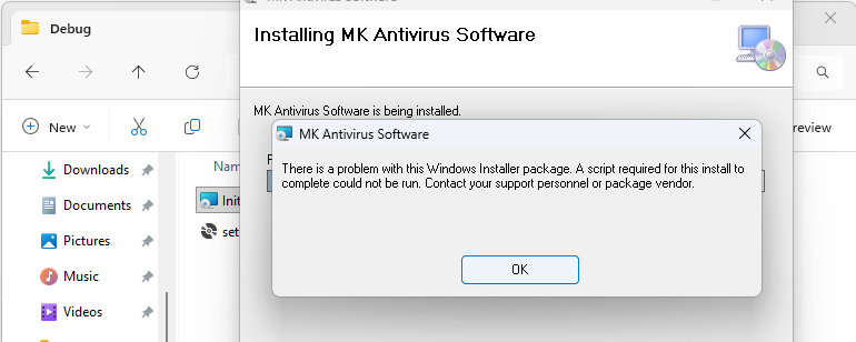 At this point, the rest should be straight forward like add a CustomAction and tell the msi to run it during/after the installation, or is it? I will show a problem right here if we gonna do it like that, this lab environment is Windows 11 Pro 25H2 btw.