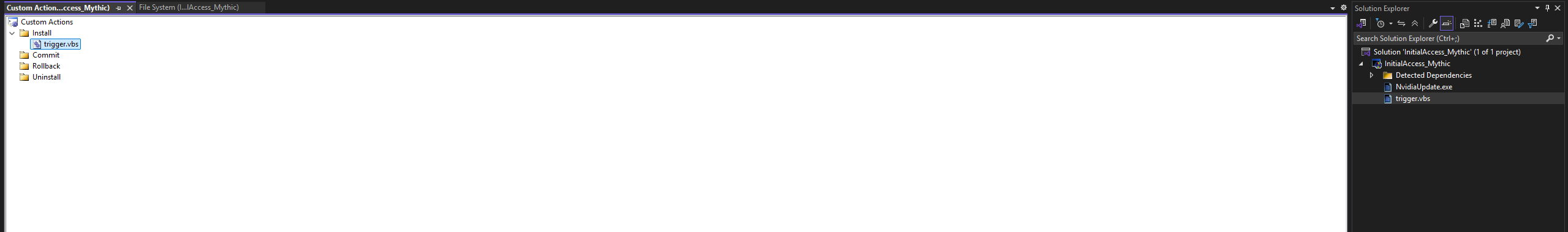 Right-click the solution -> View -> Custom Action, then we proceed to add the custom action by right-click Install -> Add Custom Action, choose our beacon PE.