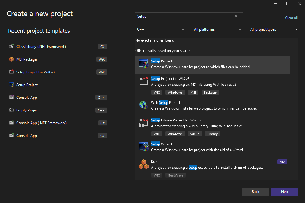 Lets spin up Visual Studio, choose Create new project then go for the Setup Project, I recommend to use Wix toolset if you already familiar with the syntax.