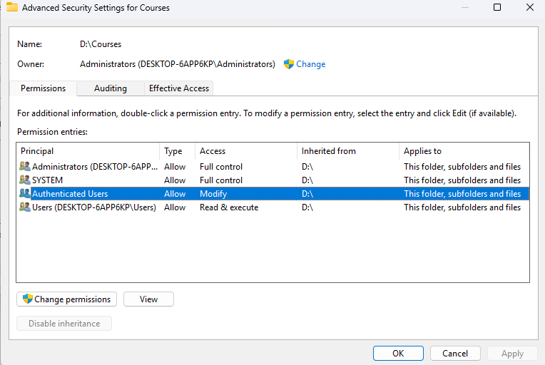 - The D:\Courses path is owned by Administrator but Authenticated Users can modify and the permission is inherit to its subfolders. This mean that when the application first installed, it required elevated privilege for the installation path and the service creation.